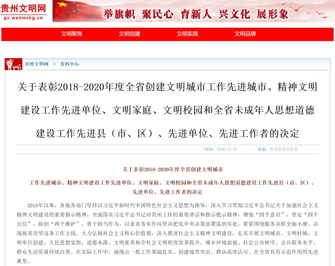 特大喜讯!贵州工商职业学院荣获贵州“2018-2020年度全省文明校园”称号
