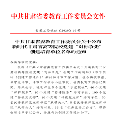 甘肃学校荣获全省高校党建工作“对标争先”创建单位
