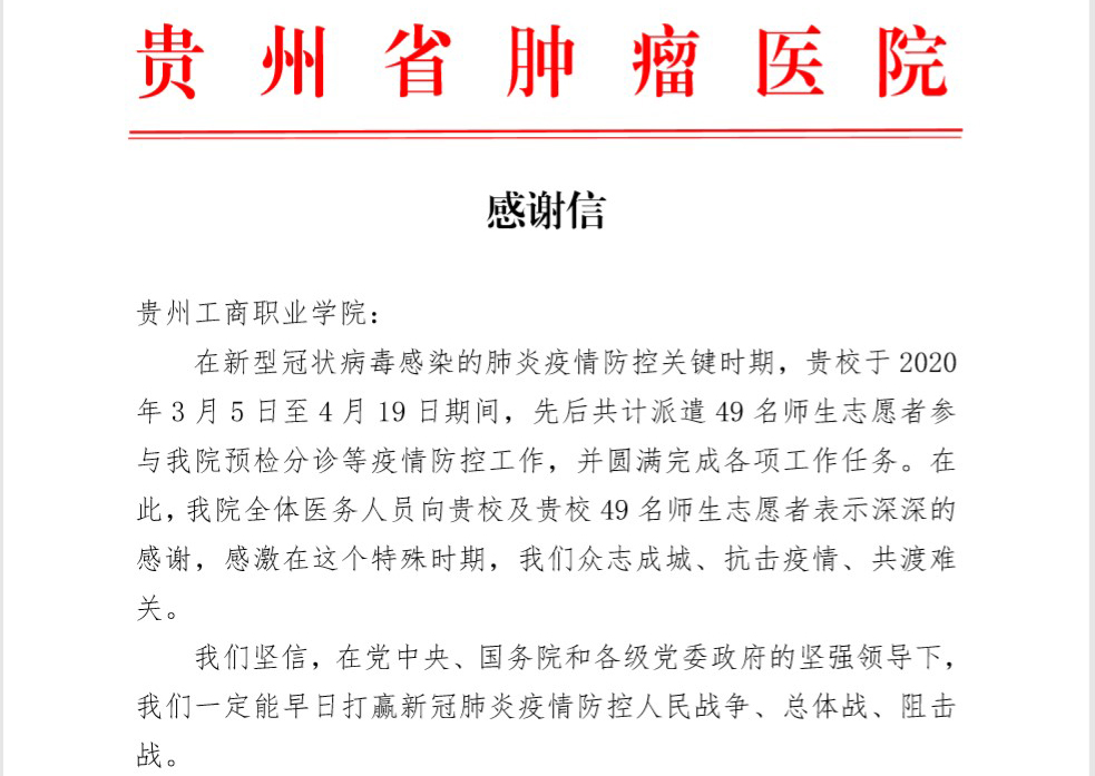 纸短情长 贵州学校收获贵州省肿瘤医院感谢信