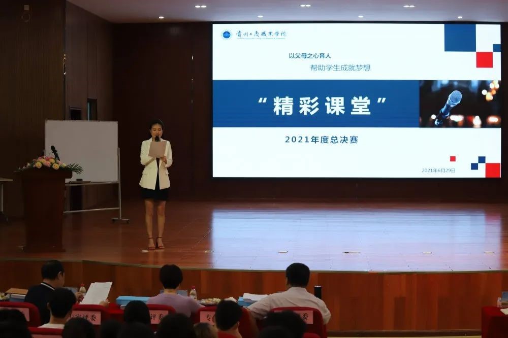 为落实OBE教学改革,全面提升学校教育教学质量,6月29日,贵州工商职业学院2021年度“精彩课堂”大赛(决赛)圆满落幕。本次比赛特邀贵州交通职业技术学院、贵州中医药大学、贵州工业职业技术学院、贵州电力职业技术学院等院校专家担任校外评委;常务副校长、副教授潘毅,副校长、教授刘焰,教务处处长、副教授赵红,科研处处长龚晓波老师,质量监督与评价中心主任、副教授李光勤担任校内专家评委。执行校长尹艺霏等领导出席本次比赛,41名学生评委及1名教学反思评审员参加比赛。