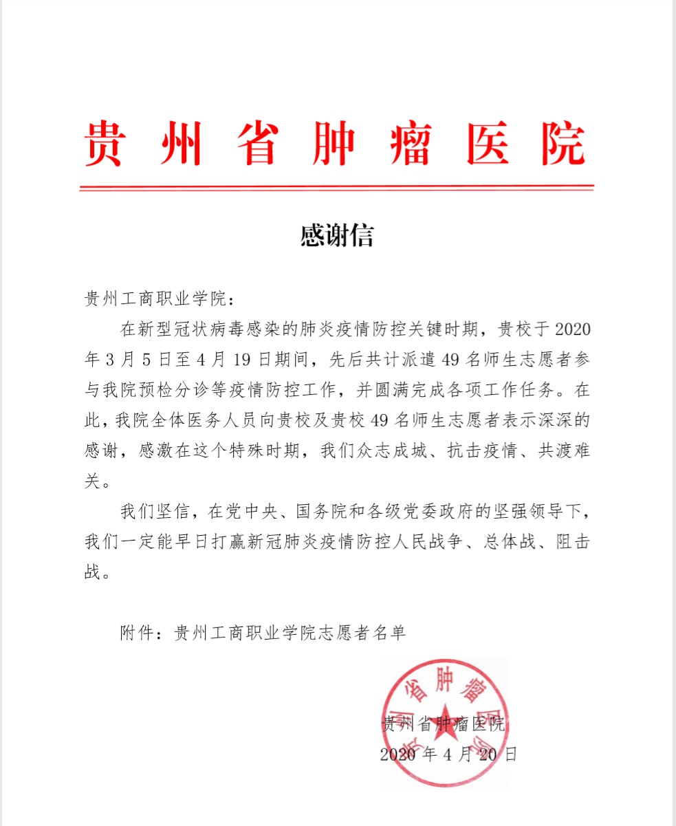 近日,贵州工商职业学院收到了一封来自贵州省肿瘤医院的感谢信,感谢贵工商49名师生志愿者参与该院疫情防控工作圆满完成各项工作。字里行间透露着温暖!