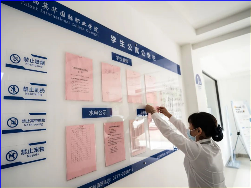 像黄晓环这样的工作人员在广西英华国际职业学院还有很多。学校要求每一位工作人员以身作则,为学生树立榜样。广西英华国际职业学院校长邹利斌说,我们每年都用立德树人成效来衡量各个学院的工作实效,同时实施教辅人员评星定级制度,激发全校工作人员下沉更好服务学生。