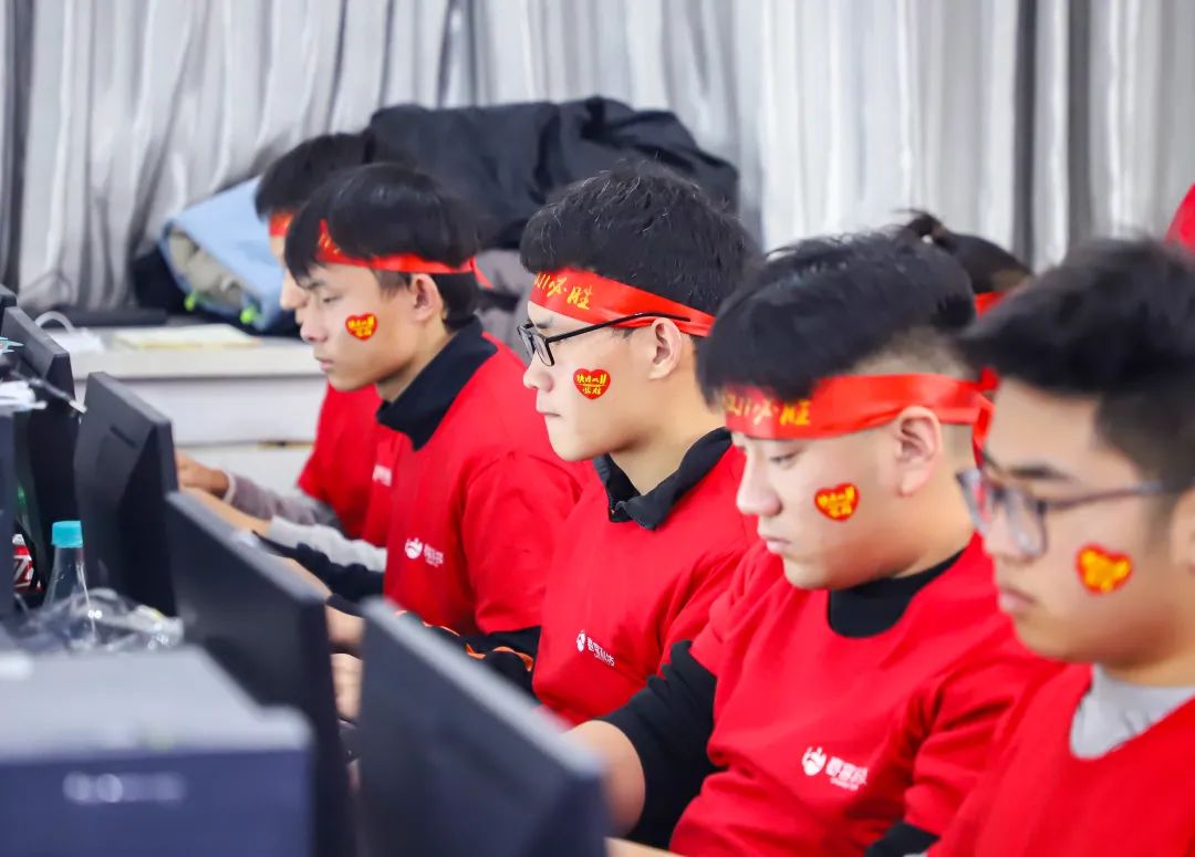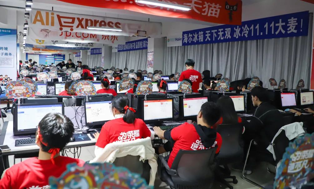 2021年11月11日零点刚过,高清大屏上交易额不断飞涨,电子商务学院数百台电脑屏幕被瞬间潮水般涌入的订单消息所占领。教室内灯火通明,弥漫着一股紧张气氛;一双双眼睛紧盯着屏幕,头上戴着“必胜”字样的红色丝带,双手飞快地敲击着键盘。与往年不同的是,此次“双十一”增加了直播带货等方式,让学生可以在直播间实地体验、学习。这是一个注定不平静的夜晚,大屏上的支付数字也在不停地跳动,一分钟,销售额破两亿。