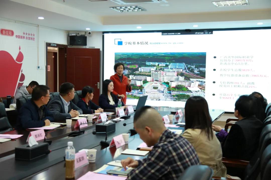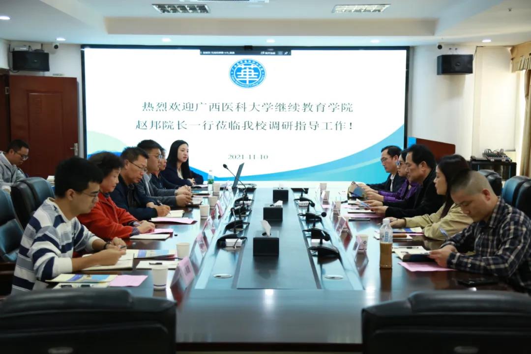 2021年11月10日,广西医科大学继续教育学院赵邦院长、刘庆委副院长、李春燕副院长一行五人莅临广西学校开展大健康学院护理专业自考专本衔接合作办学调研活动。我校党委书记黄家良、校长助理伏鹏飞、大健康学院院长彭永红、大健康学院副院长林桂清及相关部门负责人参加会议。继续教育学院院长丁雪萍主持会议。